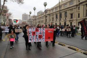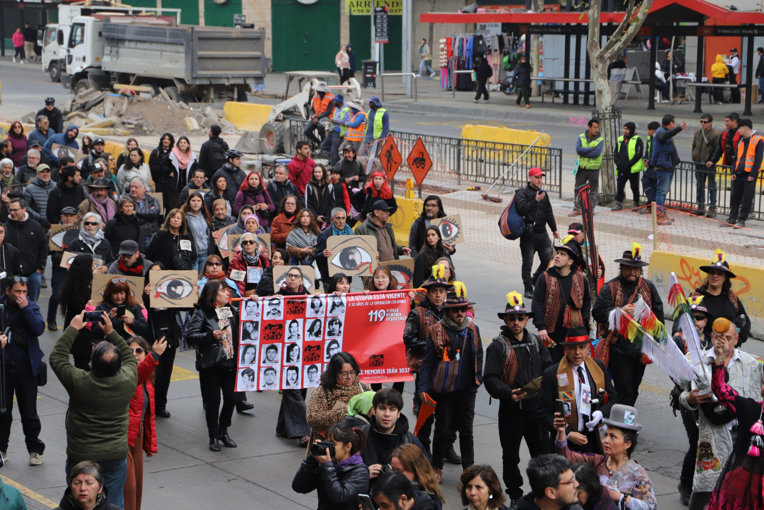 Desde temprano, columnas de organizaciones de derechos humanos, colectivos populares, estudiantes, familiares de víctimas y sobrevivientes de la represión se congregaron frente al GAM, portando siluetas negras con los rostros de quienes fueron arrancados por el terrorismo de Estado. Avanzaron por la Alameda como una procesión de memoria insurrecta, con tambores, gritos, lienzos y rabia organizada. La consigna fue clara y potente: