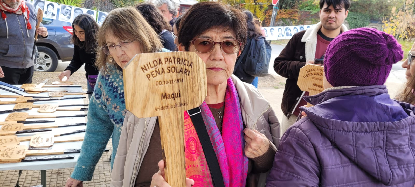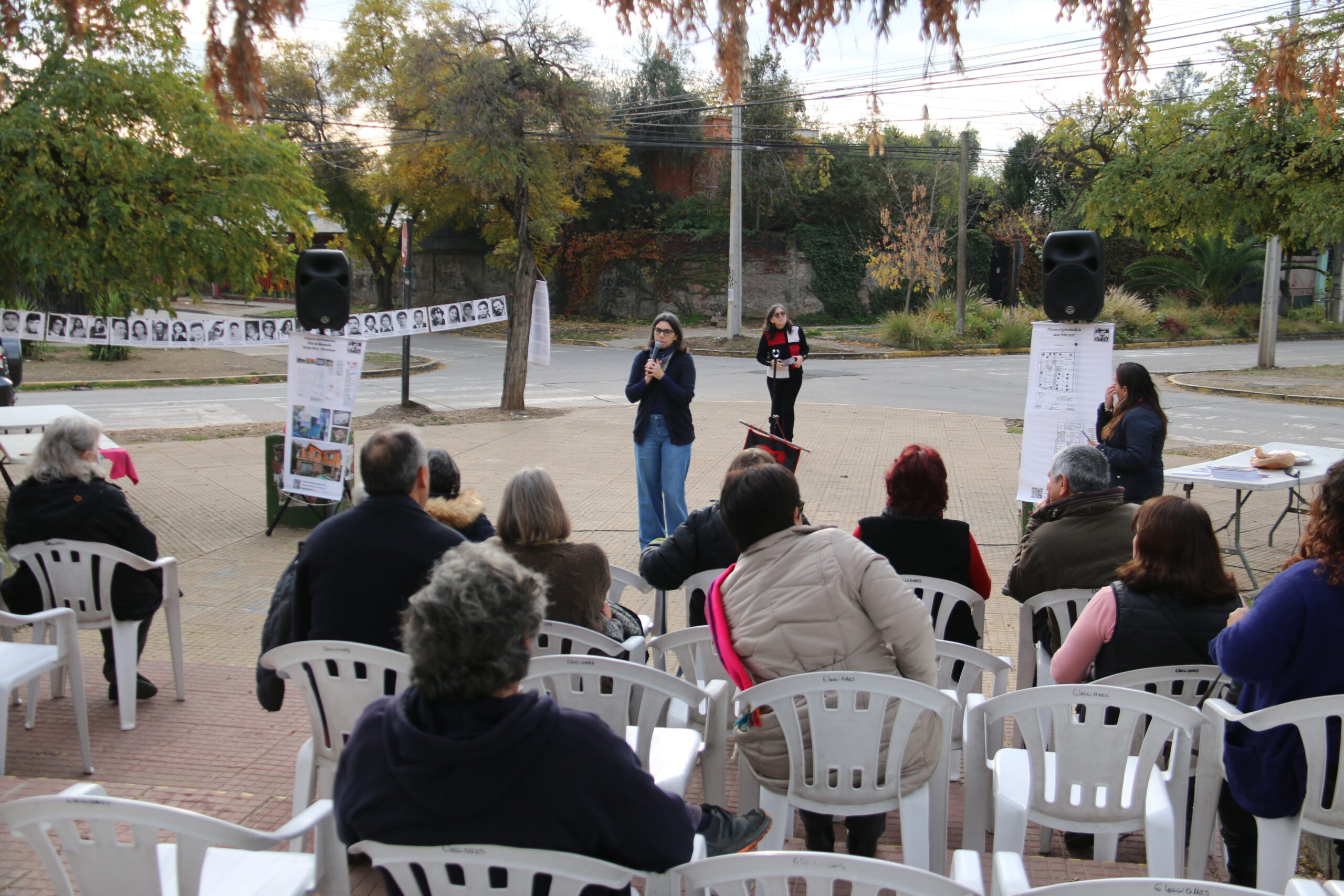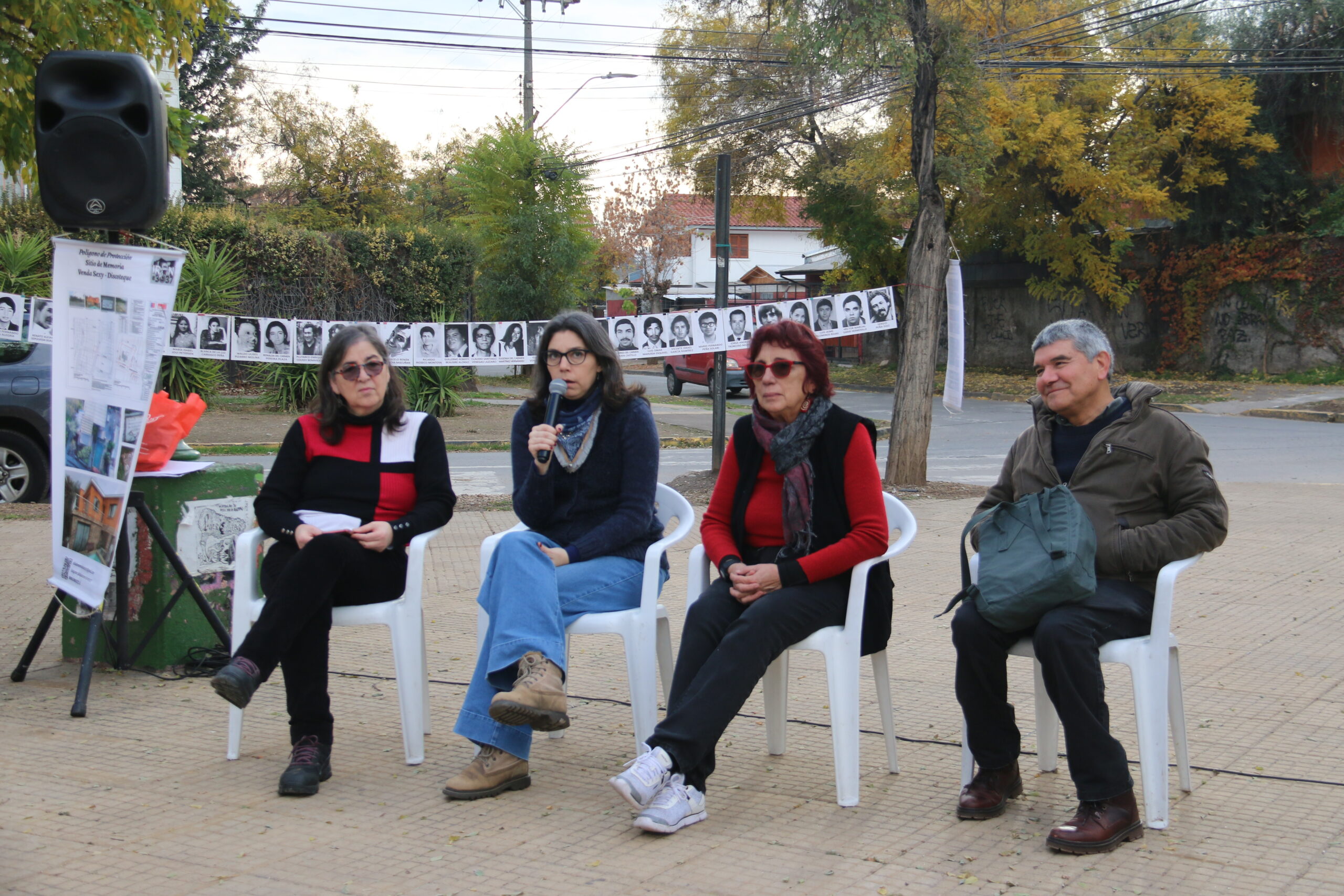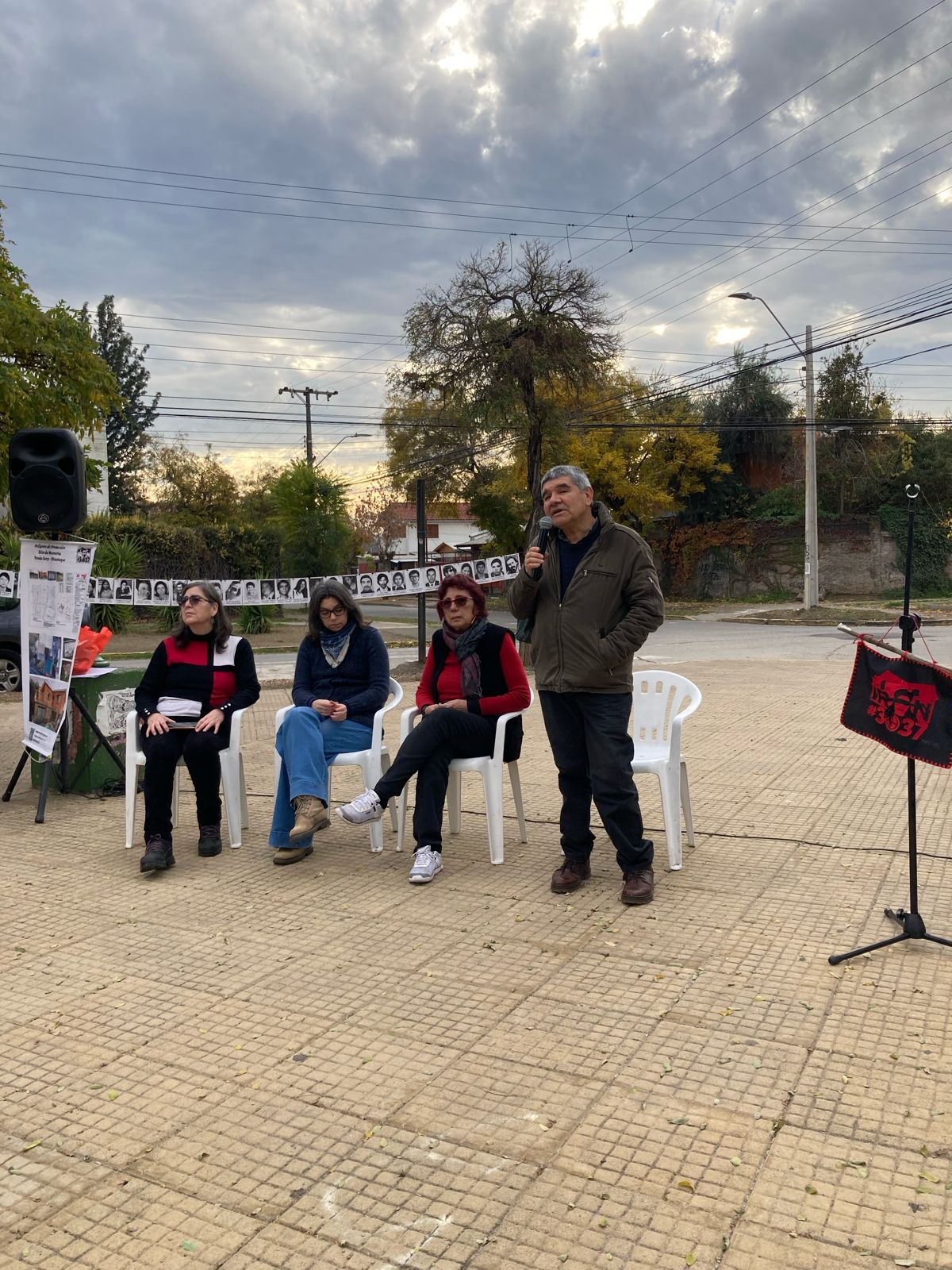 La actividad continuó en Plaza Arabia de Macul, donde a pesar del frío y los goterones, se vivió una tarde llena de emoción. Familiares, vecinas, vecinos y sobrevivientes participaron activamente en la colocación de los nombres en las placas, consolidando un acto de memoria y resistencia.