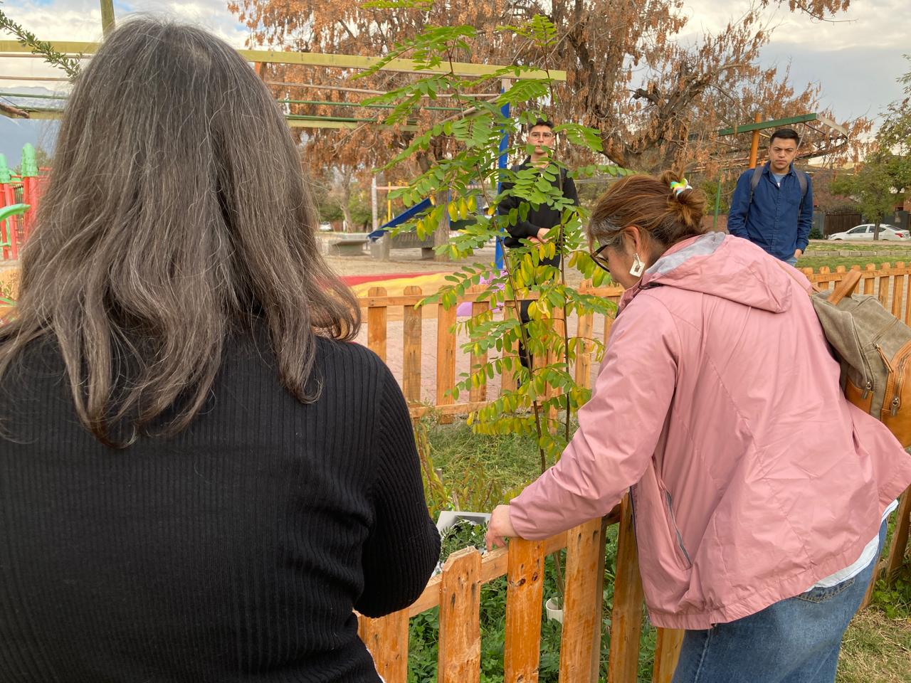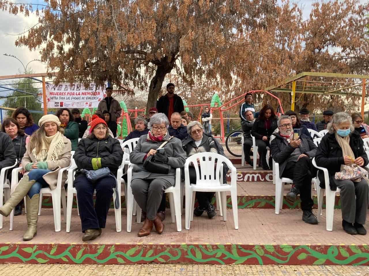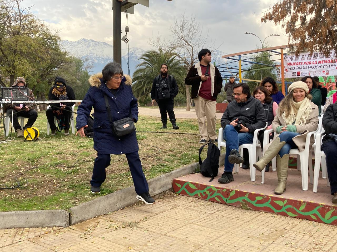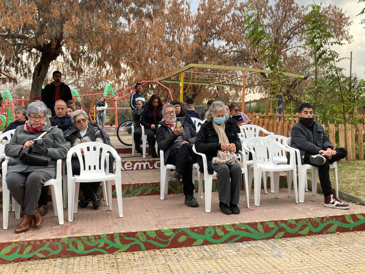 La actividad continuó en Plaza Arabia de Macul, donde a pesar del frío y los goterones, se vivió una tarde llena de emoción. Familiares, vecinas, vecinos y sobrevivientes participaron activamente en la colocación de los nombres en las placas, consolidando un acto de memoria y resistencia.