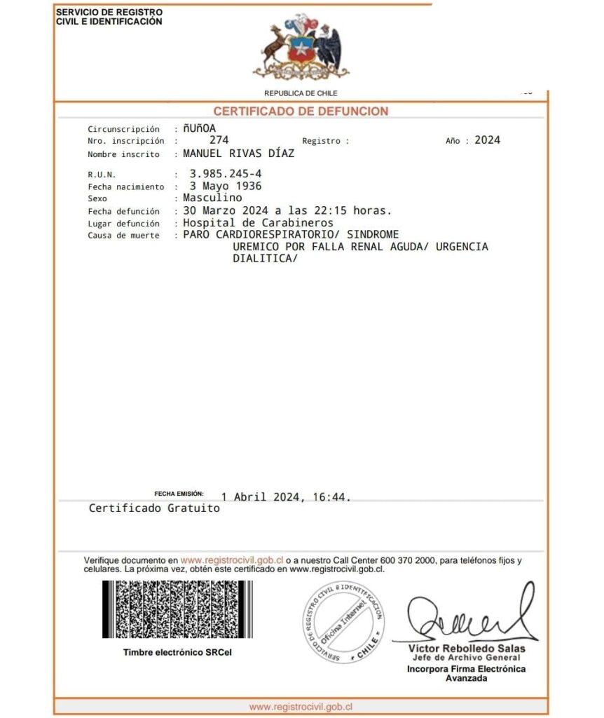 Santiago, 30 de marzo de 2024 — Manuel Rivas Díaz, un nombre infame en la historia de Chile, ha fallecido a la edad de 87 años en Hospital de Carabineros. Su partida marca el fin de una vida marcada por la oscuridad y la brutalidad.
