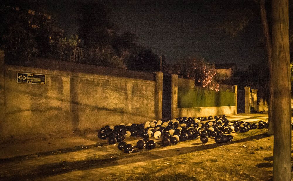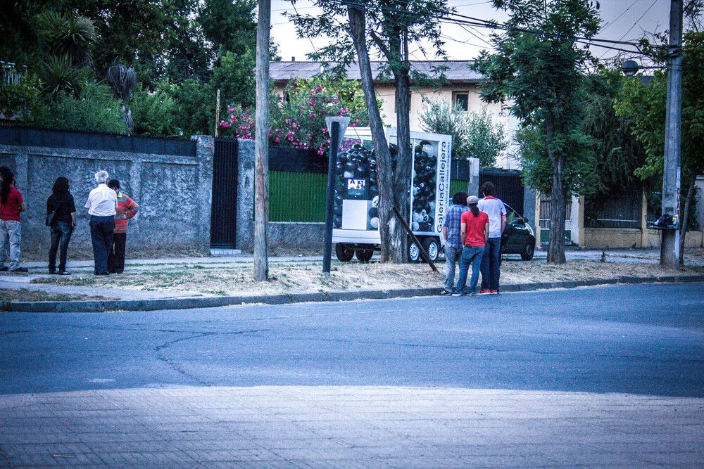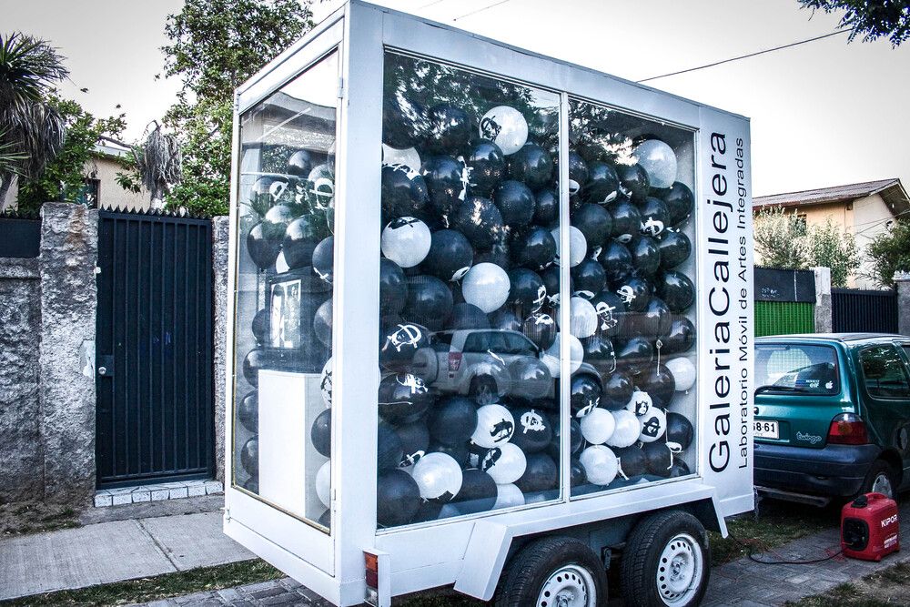 La conexión entre la operación artística y el concepto de encierro se establece por medio de la aglomeración de globos impresos con los rostros de los 119 Detenidos Desaparecidos en Chile. La detención y el concepto de encierro aparecen en los globos sostenidos por el espacio en su totalidad; las imágenes impresas en ellos se refieren al detenido, y la intervención gráfica de las fotografías es la analogía directa con los vendajes utilizados originalmente. La decisión de utilizar globos tiene que ver con dos conceptos de nuestro proyecto: el globo como elemento kitsch dentro del imaginario de la discotéque y el globo como cabeza. Los globos dispuestos al fondo de la galería, separados por color y género, aluden al acto de división de detenidos, envitrinados como cabezas sostenidas en el espacio. Se hará referencia a la desaparición en un acto más poético, en el que nosotros liberaremos los globos de este encierro (el encierro en la galería), haciendo una antonimia de la libertad y la desaparición por medio de esta acción performática. La propuesta de lugar se hace en la calle Irán 3037 con Los Plátanos, dirección del recinto de tortura.